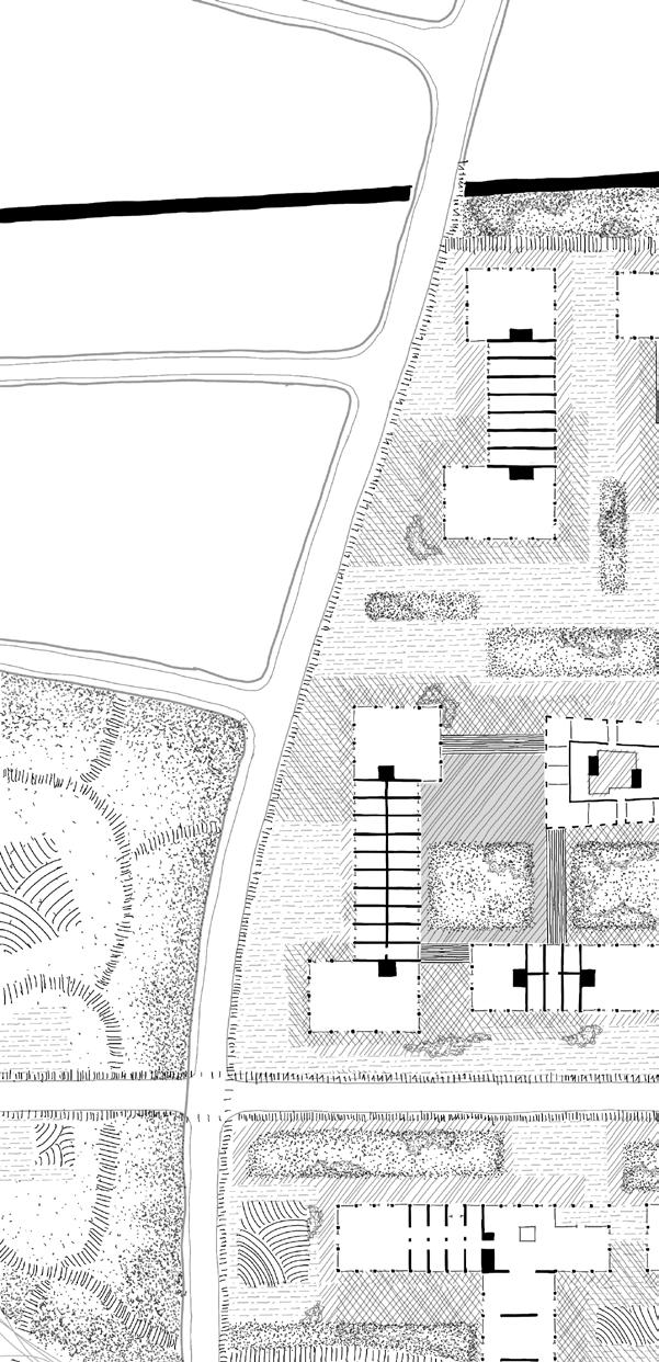 The monastic system establishes rhythmic order and variation across the district. Diverse landscapes and thickened ground levels create moments of intensity and exclusivity, thus ensuring a cohesive mobility network while reinforcing the mutual value between the district and the park.