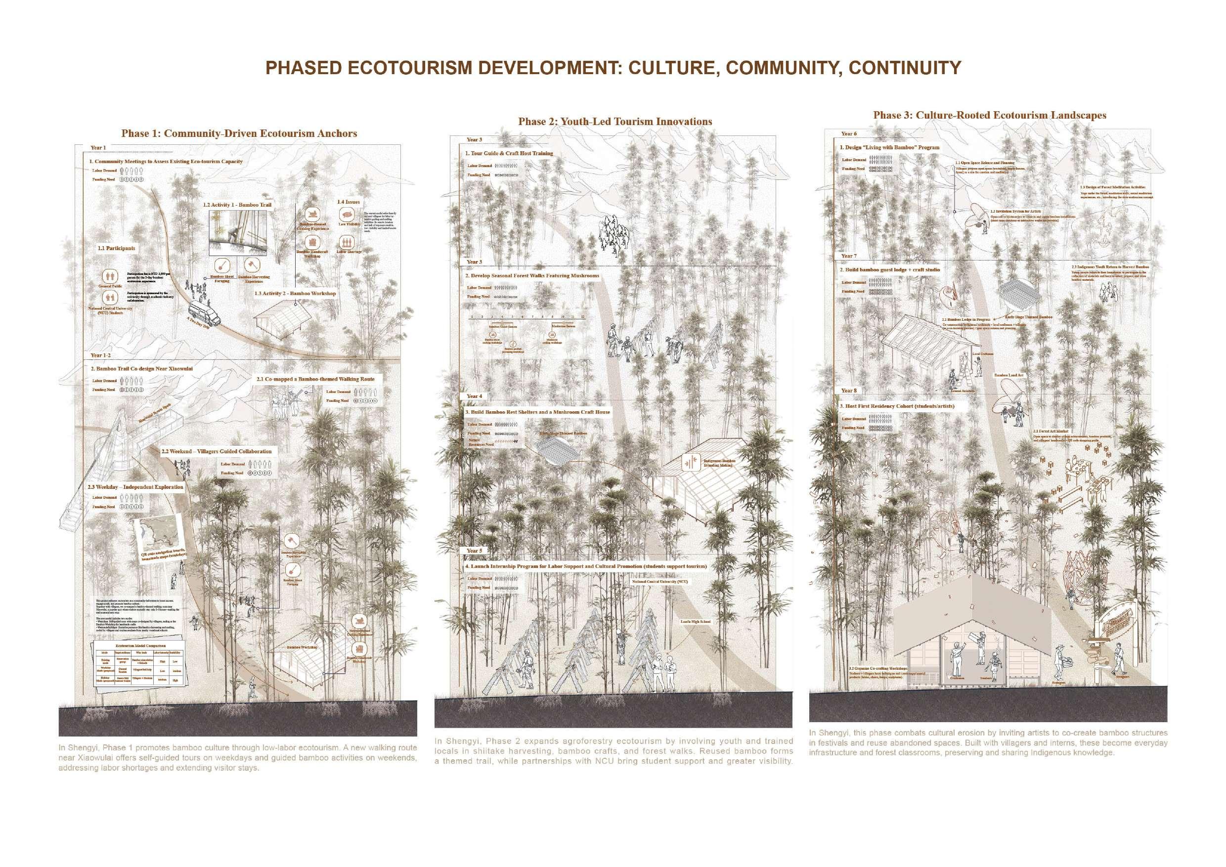 This project explores bamboo forest governance in Fuxing, Taiwan, where policy-driven abandonment has led to ecological degradation and cultural disconnection. By centering Indigenous Atayal knowledge and community participation, the project proposes three landscape strategies—reframed ecotourism, diversified agroforestry, and a knowledge production system. These interventions restore ecological function, empower local agency, and create sustainable economies. Grounded in tradition but adaptive to change, the project offers a replicable model for climate resilience and Indigenous-led conservation, bridging policy, culture, and ecology.