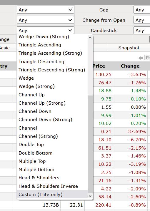 As you can see, I can select major patterns and then see all the stocks that meet that criteria.