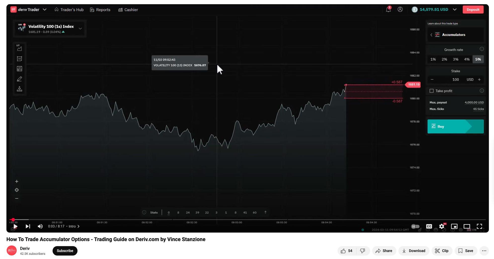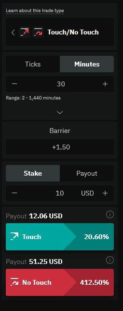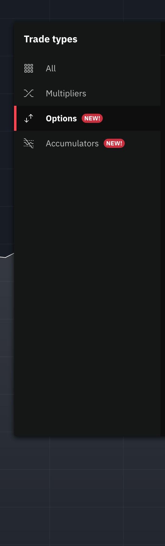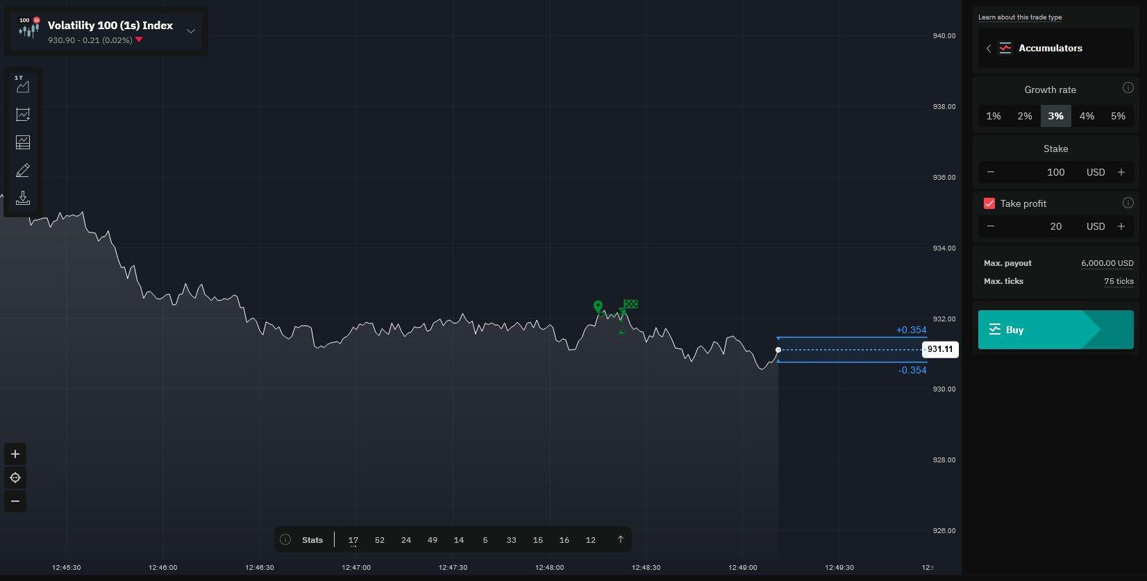 Accumulator Option: A type of trade that allows you to profit from sideways market movements by earning a compounding payout as long as the price of the underlying asset stays within a predefined range. Your potential profit grows exponentially with each tick as long as the price remains stable within your chosen boundaries. Your maximum risk is limited to your initial stake if the price breaks out of the range. Growth rate can be chosen between 1% and 5%.