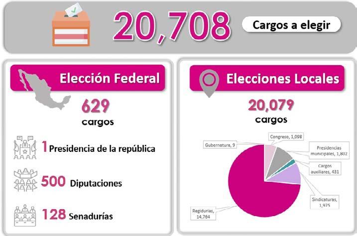 R.- Como todos sabemos, esta es la elección más grande de la historia de nuestro país, se elegirá al Presidente o Presidenta de la Republica, 128 Senadores y 500 diputados federales, 8 gobernadores y numerosos cargos en ayuntamientos y congresos locales, suman casi 20 mil cargos de elección popular. Se espera una participación ciudadana histórica y la posibilidad de tener a la primera mujer Presidente de México.