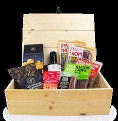 Innhold: Vanini olivenolje 250 ml, Crumbles 75g, Narr lakrisstubbe 120g, 2 stk serranoskinke 70g, salamichips hvitløk 80g, salamichips chorizo 80g, salamisticks trøffel 100g og nøttemix 60g. Logo brennes direkte inn i treesken eller trykkes på et kort som legges i esken.