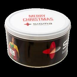 Boks i kartong med metallokk. Boksen fylles med merkevaregodt, pralinkuler eller Lübecker marsipan. Egen logo og julehilsen trykkes direkte på boksen.