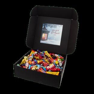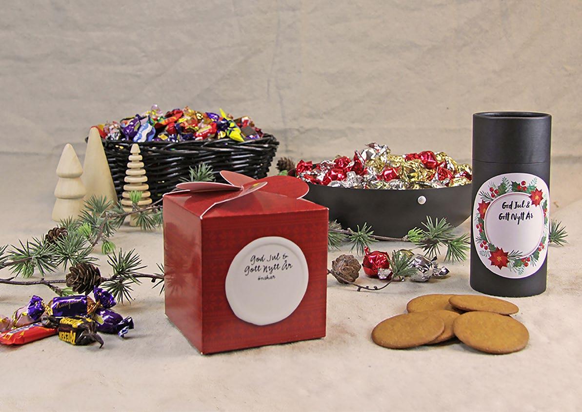 Displayboksene leveres med merkevaregodt eller pralinkuler som innhold. En etikett med din egen logo og julehilsen monteres på boksens front.