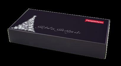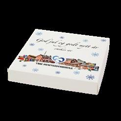 Din egen logo og julehilsen trykkes på lokket og leveres med belgisk konfekt som innhold. Konfektesken kommer i fargene sølv, gull, sort og hvit. Alle eskene leveres med hvit bunn.