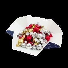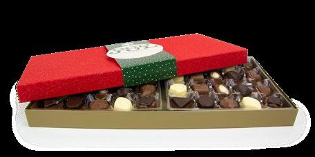 Lekker metalleske som leveres med belgisk konfekt eller pralinkuler som innhold. Logo og julehilsen trykkes på en banderoll som festes rundt eskens lokk. Leveres i fargene blå og hvit.