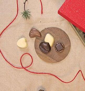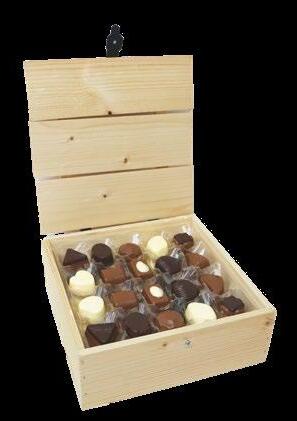 Belgisk konfekt pakket i rustikke treesker i 2 størrelse hvor logo brennes direkte inn i esken.