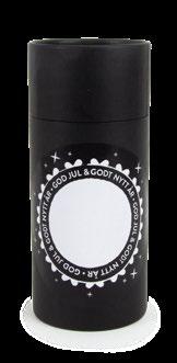 Sort rør i kartong som fylles med deilige sprø pepperkaker fra Nyåkers. Pepperkakene er pakket i transparent folie før de legges i røret. Logo og julehilsen trykkes på en rund etikett som festes i front.