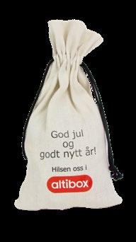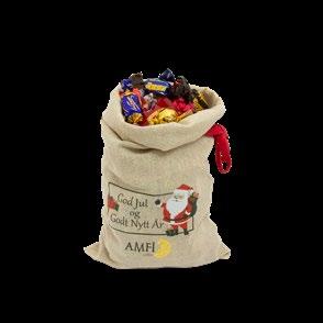 Sekkene fylles med merkevaregodt eller pralinkuler og kommer i 4 størrelser. Logo og julehilsen trykkes på et kort som festes i snoren på sekken.