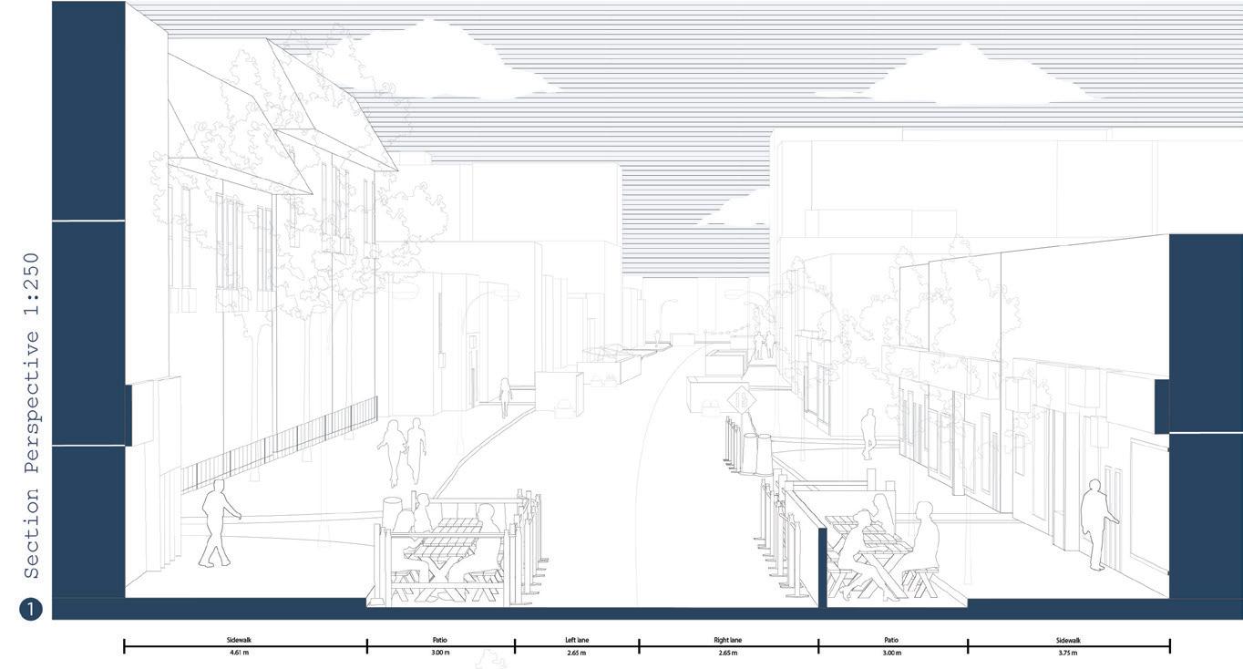 I decided to achieve this by turning the street from two lanes into one, as patios occupy the rightmost lane for the majority of the year. The intervention was designed in modular blocks of wooden frames that would become plantlike patios throughout a 4 year period. This would create a better overall experience for pedestrians and restaurant patrons as they would be protected from traffic while being enclosed in better atmospheres.
