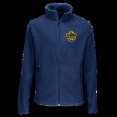 Navy sports pants jacket logo embroidered on the left chest over the heart. A navy blue shirt with school logo embroidered on the left chest over the heart. Black sneakers.