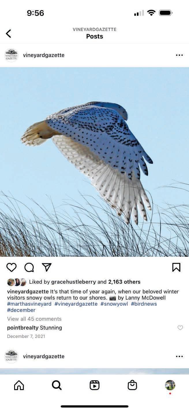 To more than 30,000 followers – many of whom love the Vineyard from a distance — @vineyardgazette is a daily dose of Island inspiration. It’s not surprising, then, that many of the most popular shots of 2022 are dreamy photos of harbors and beaches, snow-covered streets and wildlife in nature. But followers love to know what’s happening here, too. If you haven't already, be sure to add @vineyardgazette to your Instagram feed, where you'll find quick news updates, a glimpse of people in the news and a preview of more to come in the paper.