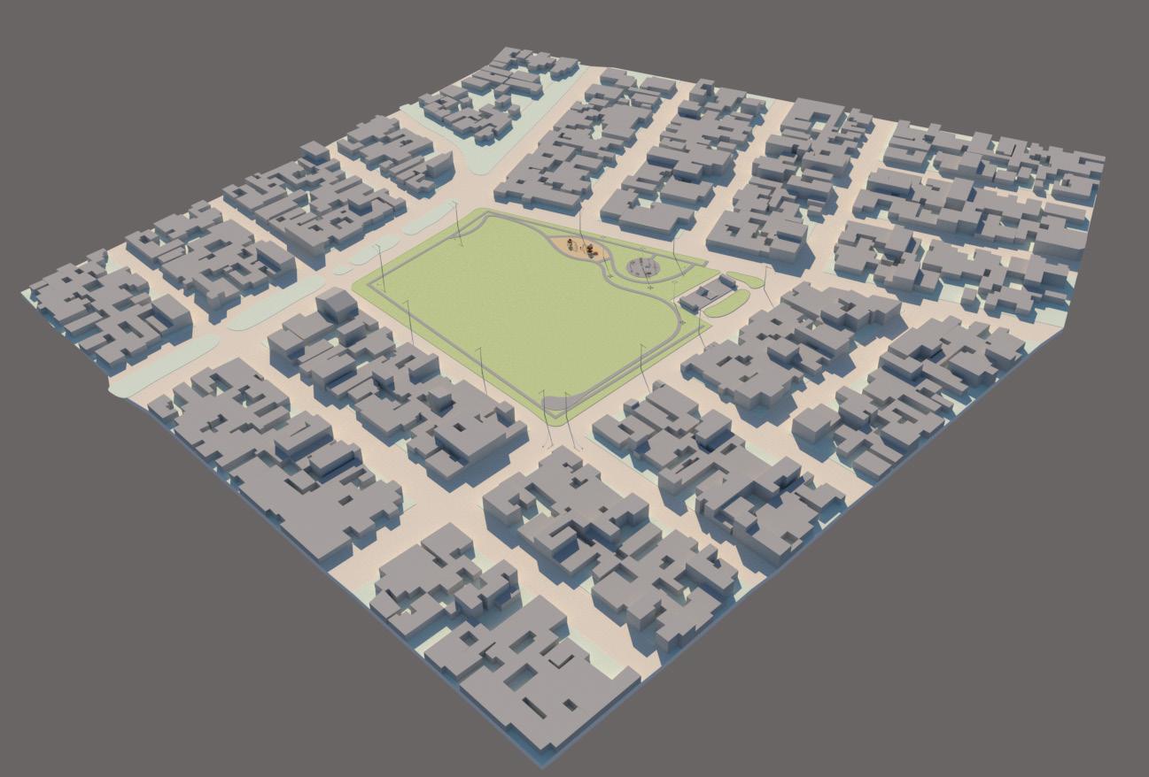 Outra estratégia do paisagismo é a criação de áreas rebaixadas abaixo do bloco esportivo, no intuito de aumentar a altura do vão livre e criar novos espaços de estar deslocados. A forma destes rebaixos foi estudada a partir da observação dos vazios do entorno imediato, considerando estes espaços como a extensão dos pátios das casas. As duas formas resultantes deste estudo estão representadas no Diagrama 22.