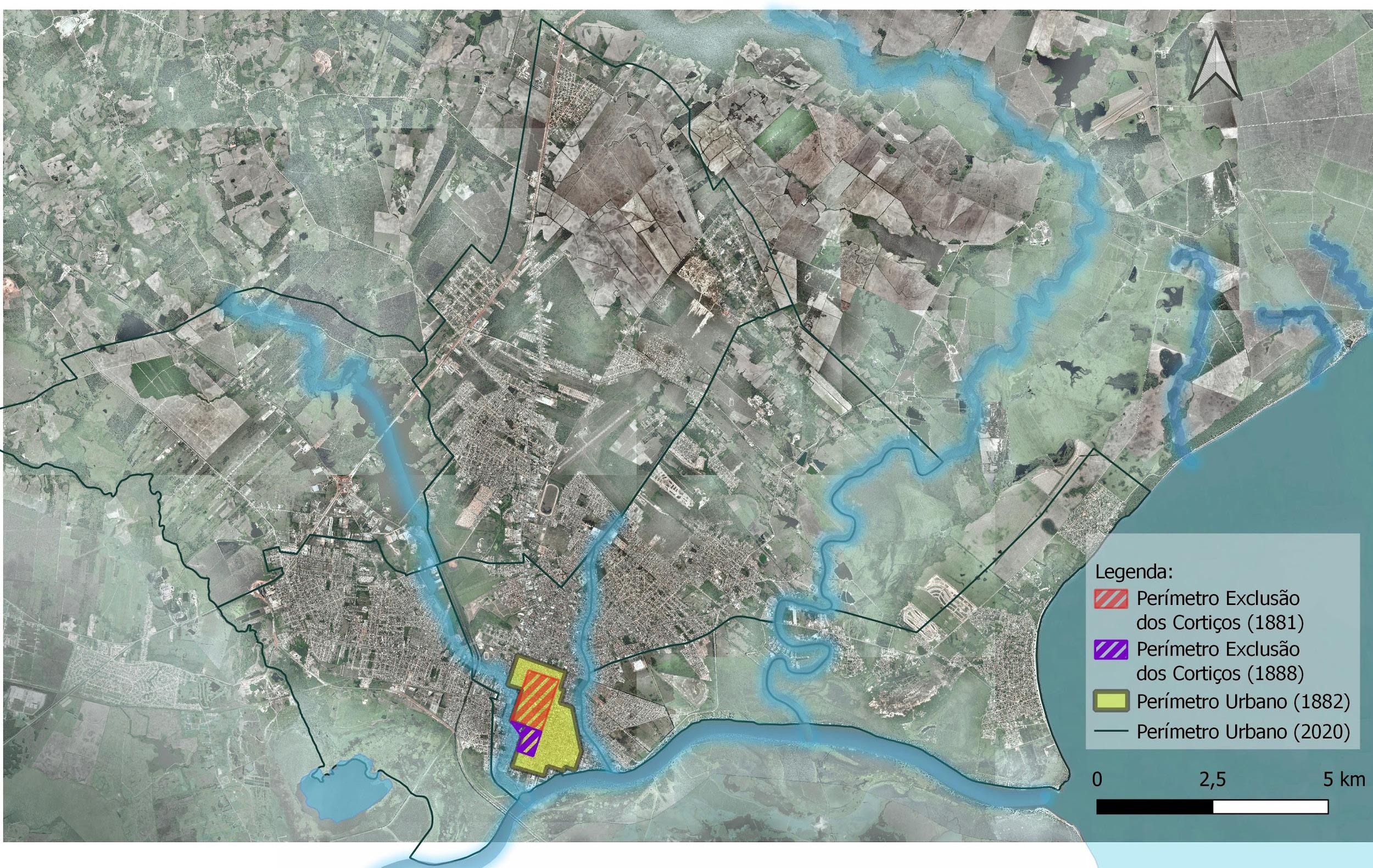 constituem as bases para a compreensão da divisão de centro e periferia em Pelotas. O desenvolvimento da atividade charqueadora da região, no século XIX, possibilitou a urbanização e a qualificação da infraestrutura básica dos primeiros loteamentos. Ao passo que o seu declínio esteve diretamente ligado ao crescimento da pobreza urbana (Carrasco, 2017). Já no final do século, a institucionalização desta desigualdade pode ser observada pelas regulamentações do poder público municipal, as quais estabeleceram, entre outras diretrizes de uso do solo, um perímetro de proibição da construção e reforma dos cortiços - tipologia de moradia popular da época - consolidando delimitações claras no espaço urbano entre lugares ocupados pela elite e lugares destinados à classe trabalhadora (Rosa, 2006).
