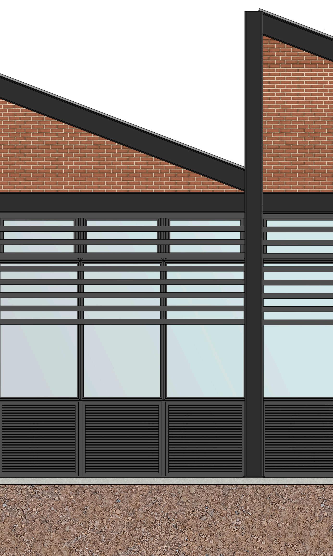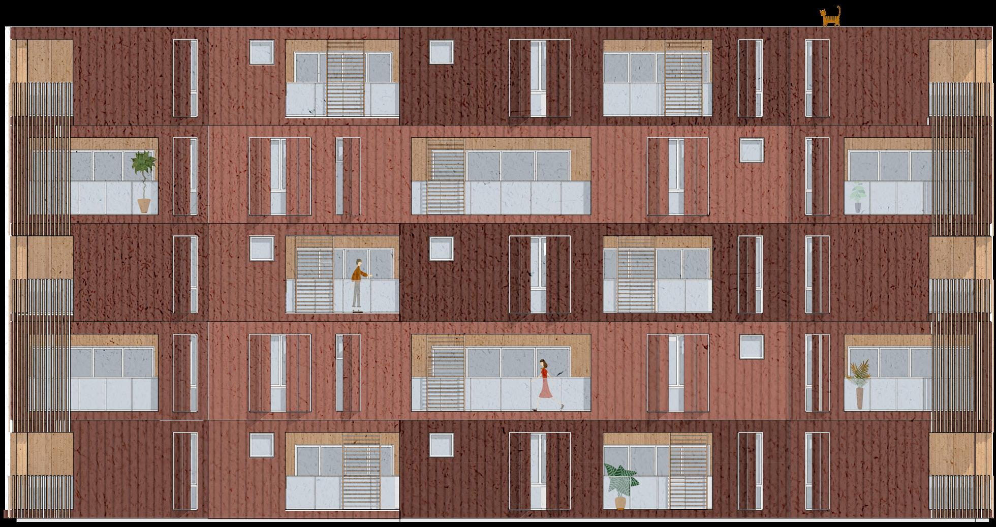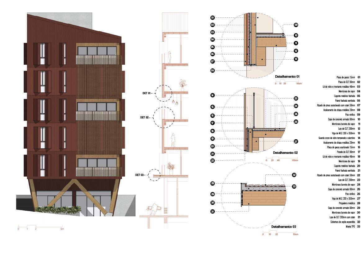 Para as fachadas e cobertura, de modo a garantir o isolamento termoacústico das unidades e a estanqueidade da edificação, foi proposto um sistema sanduíche préfabricado , cuja composição, da porção interna para a externa, se dá por: placa de gesso acartonado, placa de CLT de 3 camadas, lã de vidro, montante de alumínio, membrana barreira de vapor, suportes de alumínio e painéis, compondo uma fachada ventilada.