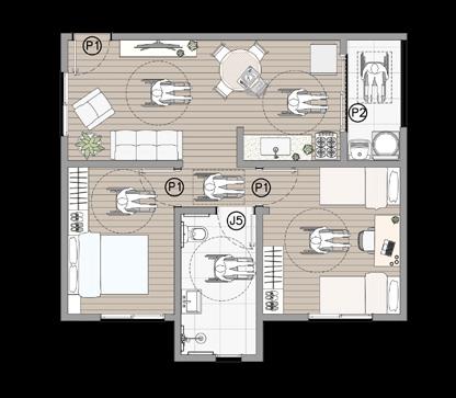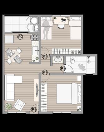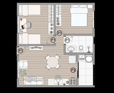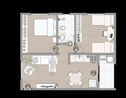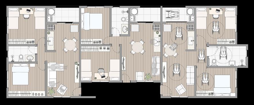 A tipologia 1 compõe um dos blocos do conjunto habitacional. Essa tipologia (1.C) contém uma variação pensada para atender as necessidades de PCDs.