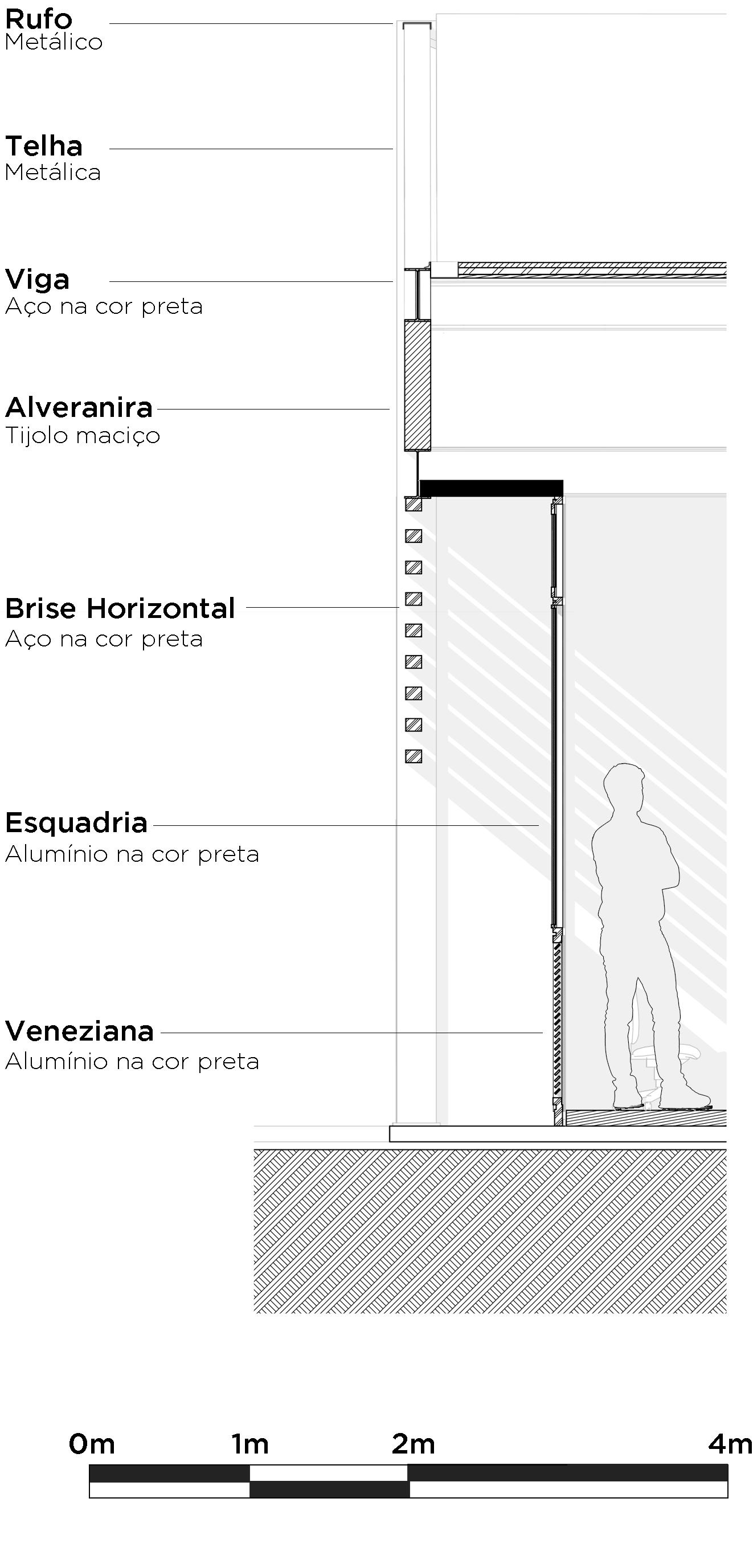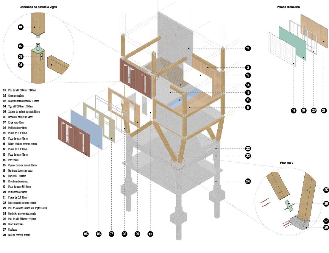 A solução estrutural, apesar de em sua maior parte ser constituida de madeira, pode ser definida como uma estrutura híbrida, empregando o concreto nas fundações, no subsolo, no cobrimento de lajes e na circulação vertical, onde funciona como núcleo rígido. O aço, para além de estar presente na armação do concreto armado, foi empregado nas conexões dos pilares e vigas. Apesar de serem materiais mais nocivos, do ponto de vista ambiental, é importante olharmos para os materiais observando suas diferenças e potencialidades, uma vez que a performance de cada um varia conforme a situação ao qual são empregados.