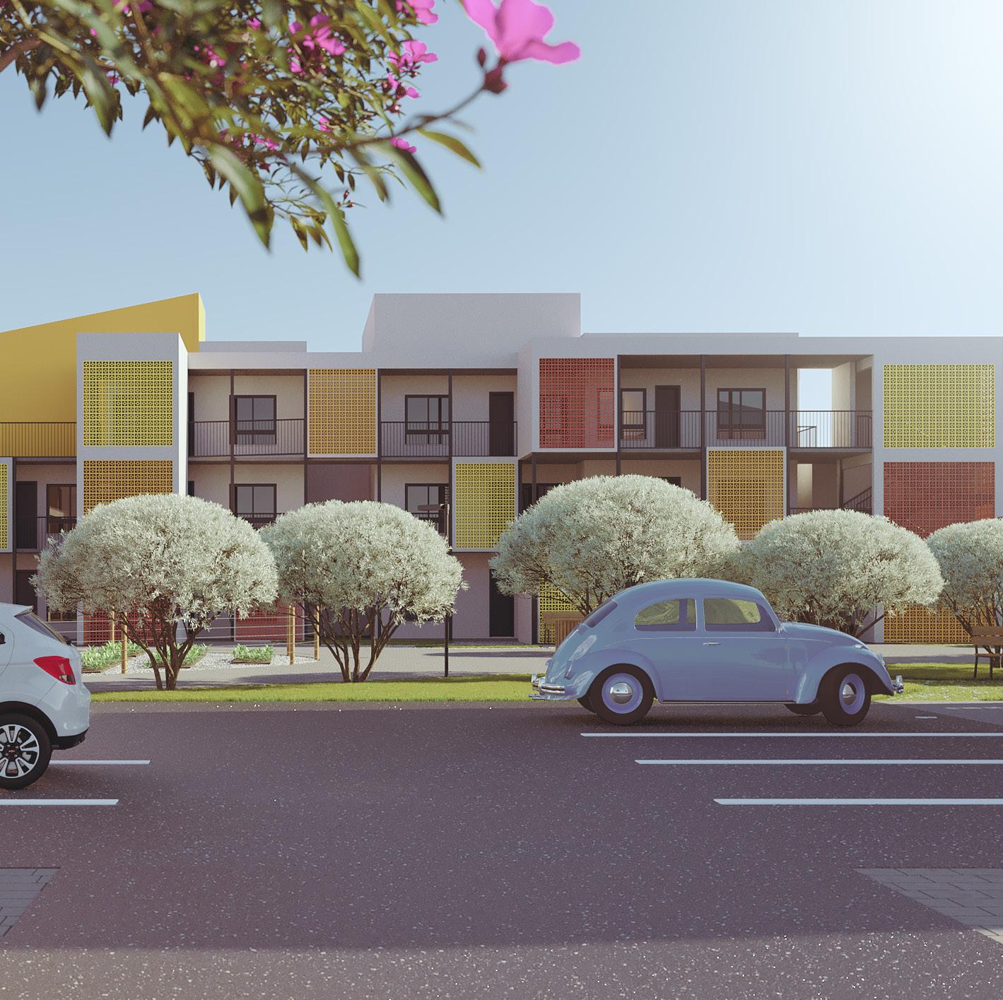 A tipologia 2 compõe o restante dos blocos do conjunto habitacional. Ela foi pensada para que pudesse ser facilmente replicada em diferentes volumetrias. Dessa forma, utilizando a mesma tipologia, que seria espelhada em alguns momentos, é possível criar diferentes formas e conferir ainda mais características únicas para os blocos.