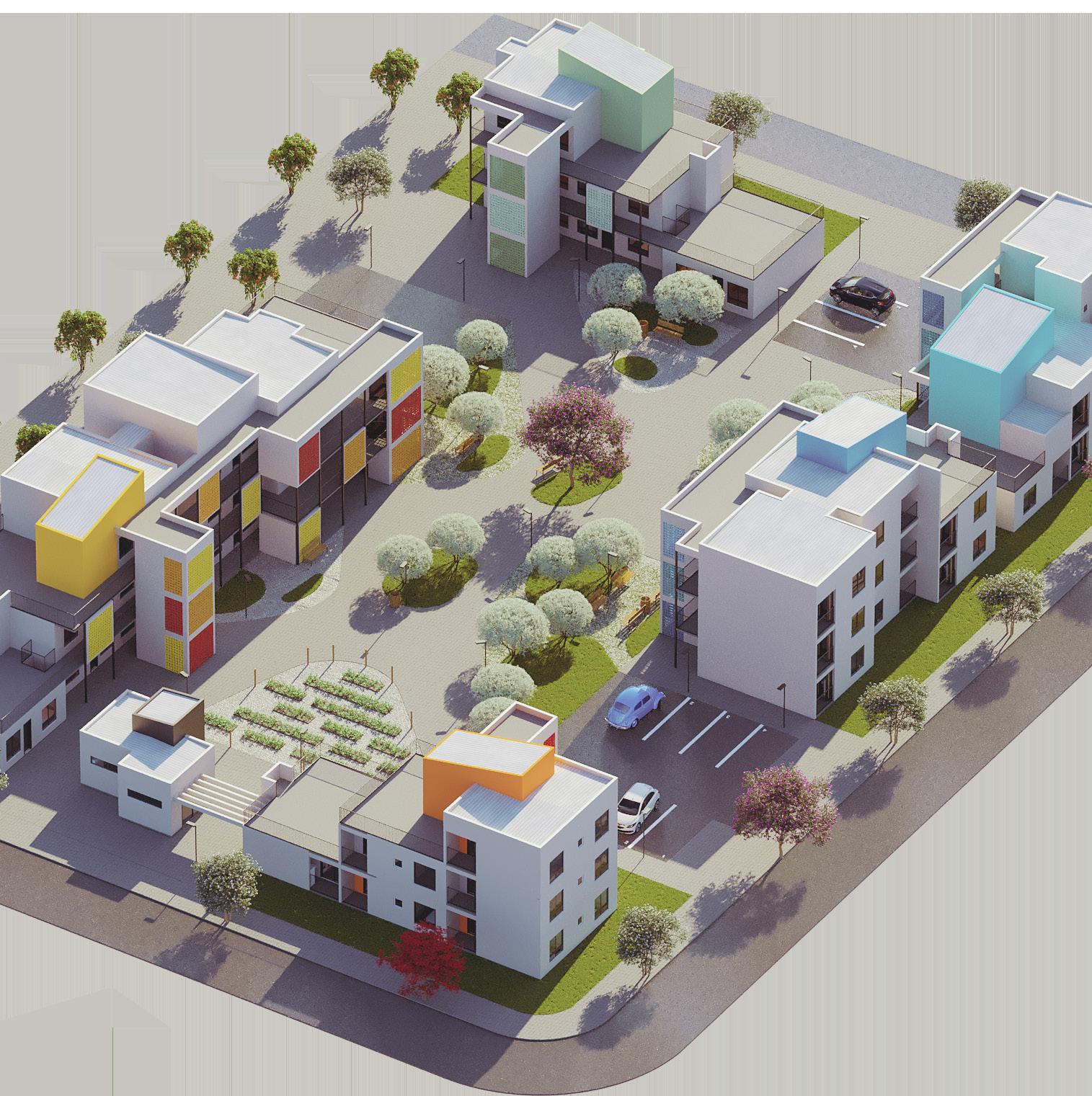 Finalizamos introduzindo mais um eixo vertical, criando quatro acessos e quatro blocos para o conjunto habitacional