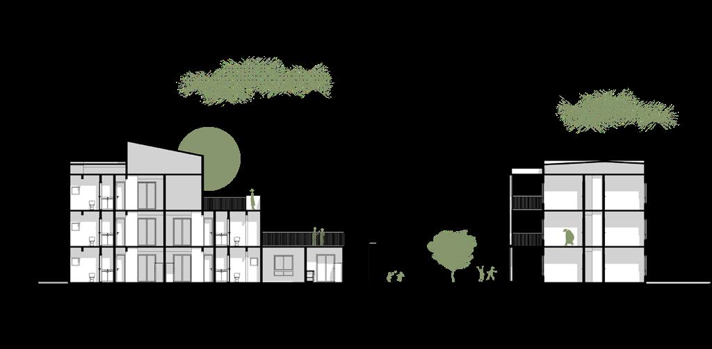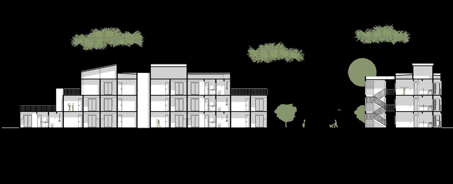 Foram estabelecidos recuos da fachada norte, leste e oeste para a criação de varandas privativas para todas as unidades. Tais recuos, também possibilitam a criação de áreas de contato entre o interior e o exterior do edifício, criando ambientes de contemplação e de conexão com a rua.