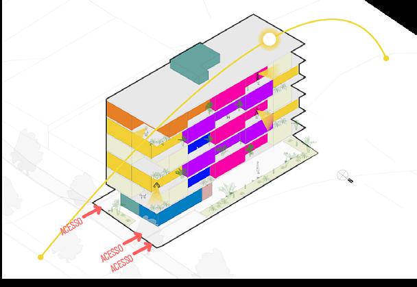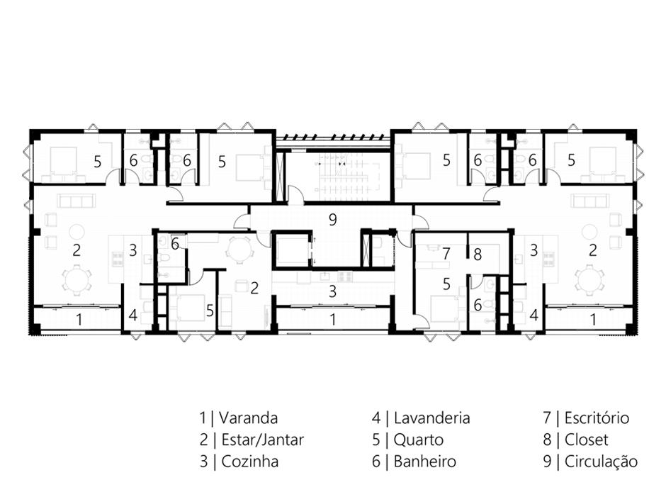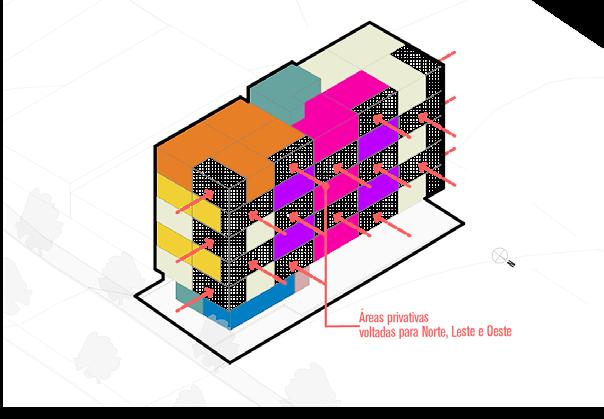 Como ponto de partida para a criação dos apartamentos, deliberou-se que todas as unidades, para além da infraestrutura básica habitacional (quarto, cozinha, banheiro e espaço de serviço), possuam áreas privativas conectadas com o exterior do edifício, ventilação adequada e contem, ao menos, com uma face voltada exposta à fachada norte da edificação, garantindo que todas as unidades tenham acesso à insolação.