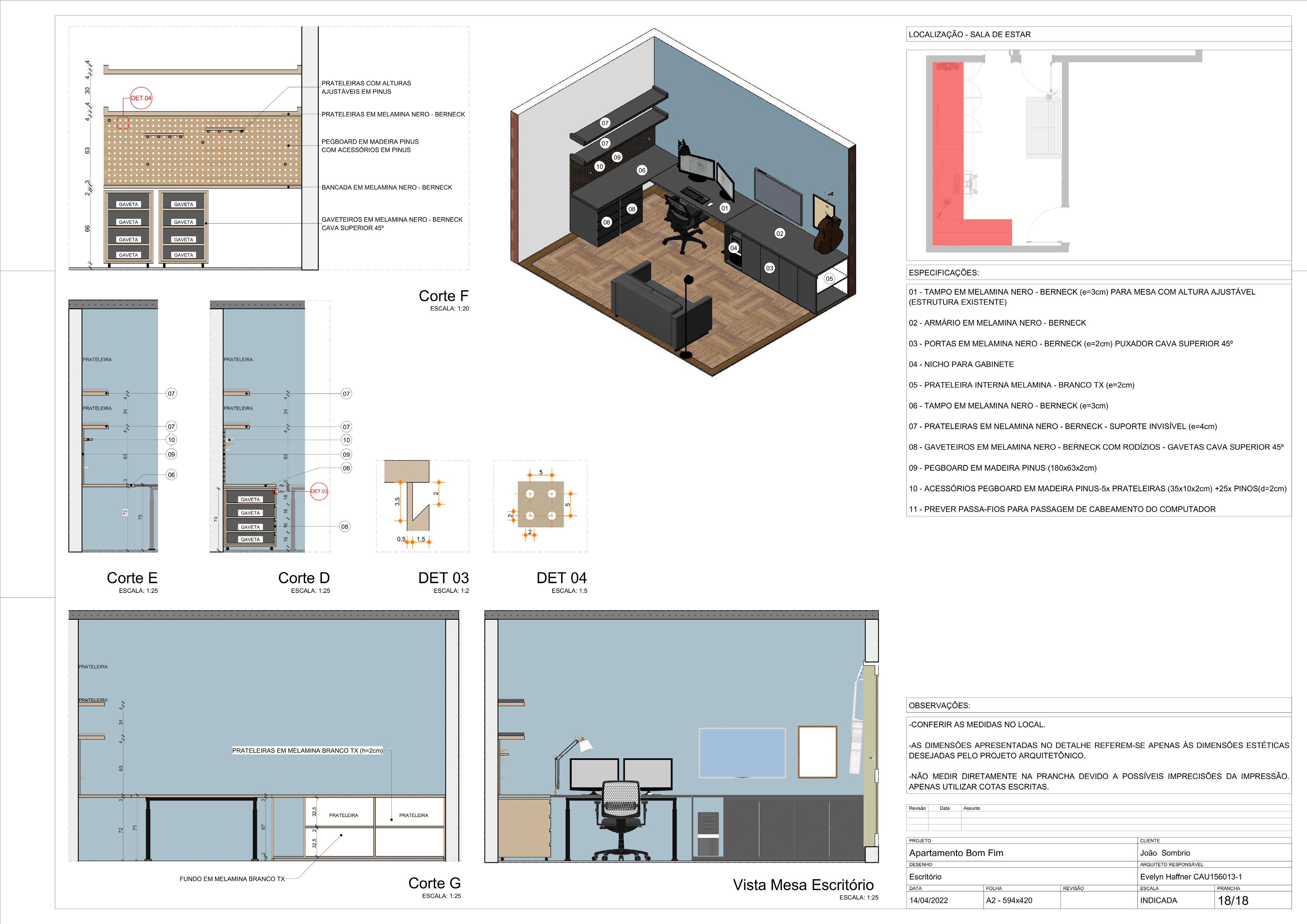 44 GSPublisherVersion 0.95.100.100 Revisão Data Assunto PROJETO Apartamento Bom Fim DESENHO Escritório DATA 14/04/2022 FOLHA A2 - 594x420 75 197,3 159,4 70 60 180 180 30 60 70 197,3 159,4 2 D E A B C G F H 72 3 75 3 2 67 3 75 2 2 64 2 DET 02 3 2 32,5 2 32,5 3 5 75 2 2 64 2 45 60 2 2 37 2 2 2 56 2 15,2 129 15,2 39,68 39,68 39,68 39,68 2 34 2 77,65 2 77,65 2 2 66 2 64 70 D E A B C G F H 2 1,5 0,5 3,5 5 2 Planta Baixa h=120cm ESCALA: 1:25 Corte A ESCALA: 1:25 Corte B ESCALA: 1:25 Corte C ESCALA: 1:25 Planta Baixa h=50cm ESCALA: 1:25 DET 02 ESCALA: 1 2 PORTAS COM CAVA SUPERIOR 45º PEGBOARD EM MADEIRA PINUS COM ACESSÓRIOS EM PINUS INTERIOR EM MELAMINA BRANCO TX MESA COM ALTURA AJUSTÁVEL TAMPO EM MELAMINA NERO - BERNECK NICHO PARA GABINETE GAVETEIROS EM MELAMINA NERO - BERNECK CAVA SUPERIOR 45º PRATELEIRAS EM MELAMINA NERO - BERNECK SUPORTE INVISÍVEL 01 02 04 06 07 08 03 05 08 02 07 09 06 02 01 02 05 03 11 11 PREVER PASSA-FIOS PARA PASSAGEM DE CABEAMENTO DO COMPUTADOR 11 LOCALIZAÇÃO - SALA DE ESTAR PRATELEIRA OBSERVAÇÕES: -CONFERIR AS MEDIDAS NO LOCAL -AS DIMENSÕES APRESENTADAS DESEJADAS PELO PROJETO ARQUITETÔNICO -NÃO MEDIR DIRETAMENTE NA APENAS UTILIZAR COTAS ESCRITAS ESPECIFICAÇÕES: 01 - TAMPO EM MELAMINA NERO (ESTRUTURA EXISTENTE) 02 - ARMÁRIO EM MELAMINA NERO 03 - PORTAS EM MELAMINA NERO 04 - NICHO PARA GABINETE 05 - PRATELEIRA INTERNA MELAMINA 06 - TAMPO EM MELAMINA NERO 07 - PRATELEIRAS EM NELAMINA 08 - GAVETEIROS EM MELAMINA 09 - PEGBOARD EM MADEIRA PINUS 10 - ACESSÓRIOS PEGBOARD EM 11 - PREVER PASSA-FIOS PARA EXECUTIVO