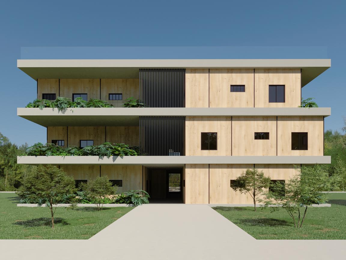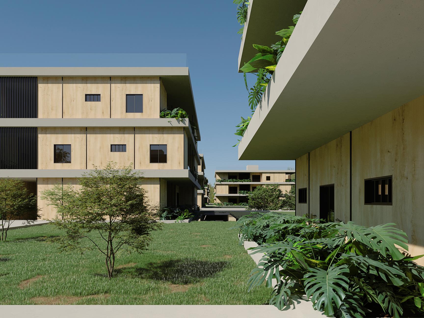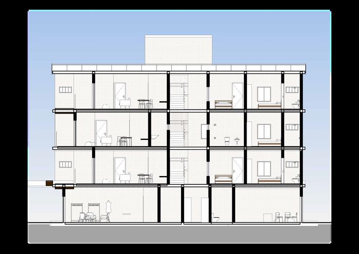 A partir do terraço o prédio se edifica em 3 andares, que rotacional em 180 graus a cada pavimento afim de diversificar o layout e proporcionar a fachada diversificada.