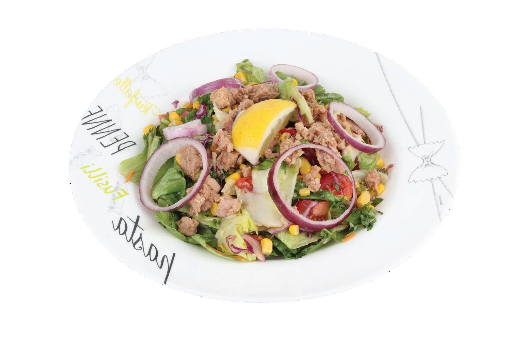 Tuna, salata, rajčica, kukuruz, maslinovo ulje, luk. (Tuna, salad, tomato, corn, olive oil, onion)