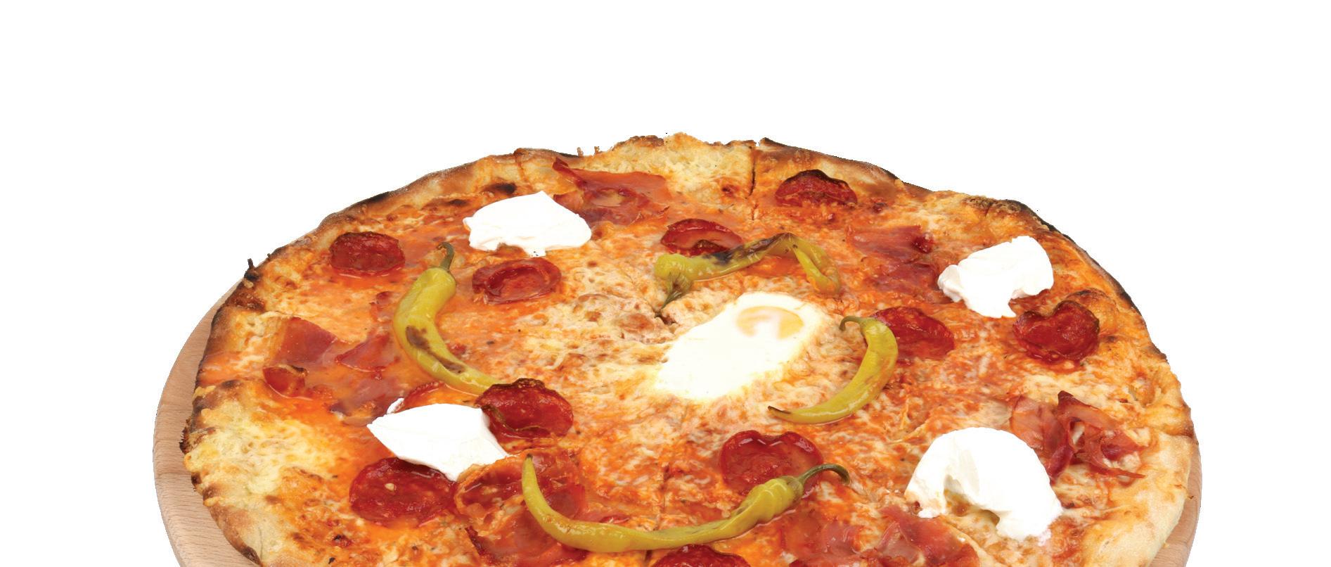 Rajčica, sir, pršut, kulen, jaje, vrhnje, blage feferone, šunka (tomato, cheese, prosciutto, kulen, egg, sour cream, mild pepperoni, ham) sadrži alergene 1, 3, 6, 7