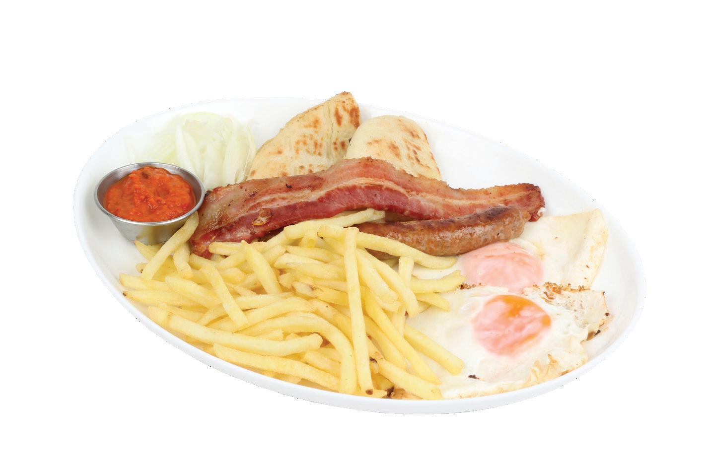 slanina, 2 x jaje, kobasica, lepinja, pommes frites, ajvar (bacon, 2 x egg, sausage, bun, french fries, ajvar, salad) salata sadrži alergene 1, 3, 7