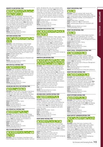 Description: 110km SW Brisbane. World Heritage Area, peaks, volcanic escarpment, ridges, rare wildlife, forests. Easy walks, hard hikes, great views, picnics. Notes: Car-based camping at Spicer’s Gap (no caravans), Poplar Flat and Manna Gum. Limited bush camping for experienced hikers. Private caravan park and camping at Queen Mary Falls (07 4664 7151). contact: EPA Main Range office phone: 07 4666 1133 Fax: 07 4666 1297 email: main.range@epa.qld.gov.au or info@derm.qld. gov.au Website: www.epa.qld.gov.au or www. queenslandholidays.com.au