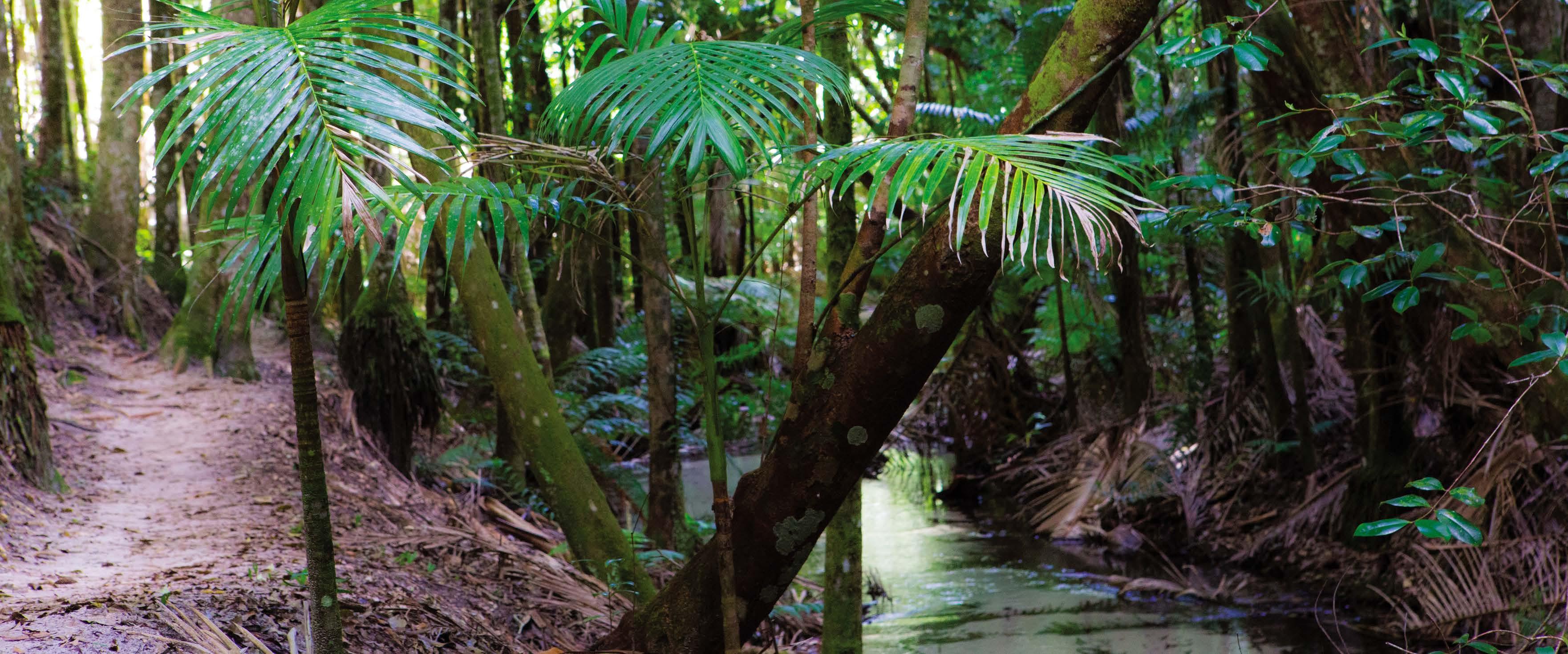 Crystal-clear, freshwater streams fed by the water table and rainforest trees literally growing out of the sand are matched with an, at times, alien landscape created by huge sand blows from winds belting across the Pacific.