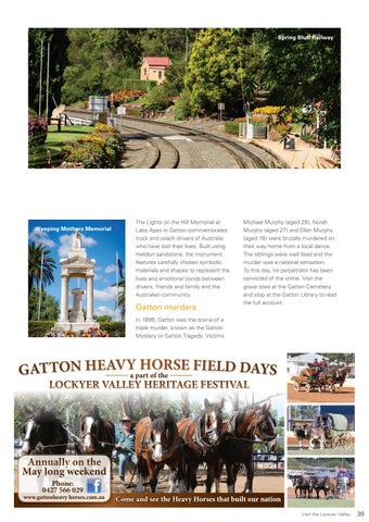 Michael Murphy (aged 29), Norah Murphy (aged 27) and Ellen Murphy (aged 18) were brutally murdered on their way home from a local dance. The siblings were well liked and the murder was a national sensation. To this day, no perpetrator has been convicted of the crime. Visit the grave sites at the Gatton Cemetery and stop at the Gatton Library to read the full account.