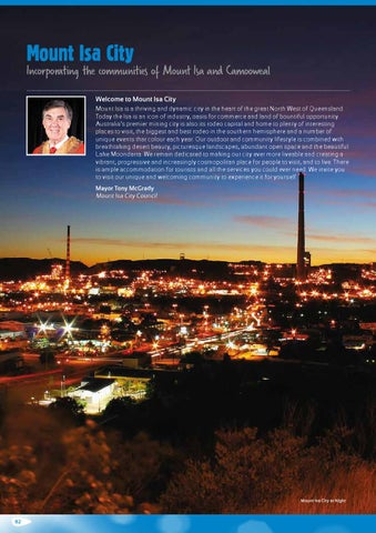 Incorporating the communities of Mount Isa and Camooweal Welcome to Mount Isa City Mount Isa is a thriving and dynamic city in the heart of the great North West of Queensland. Today the Isa is an icon of industry, oasis for commerce and land of bountiful opportunity. Australia’s premier mining city is also its rodeo capital and home to plenty of interesting places to visit, the biggest and best rodeo in the southern hemisphere and a number of unique events that colour each year. Our outdoor and community lifestyle is combined with breathtaking desert beauty, picturesque landscapes, abundant open space and the beautiful Lake Moondarra. We remain dedicated to making our city ever more liveable and creating a vibrant, progressive and increasingly cosmopolitan place for people to visit, and to live. There is ample accommodation for tourists and all the services you could ever need. We invite you to visit our unique and welcoming community to experience it for yourself. Mayor Tony McGrady Mount Isa City Council