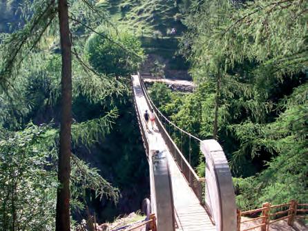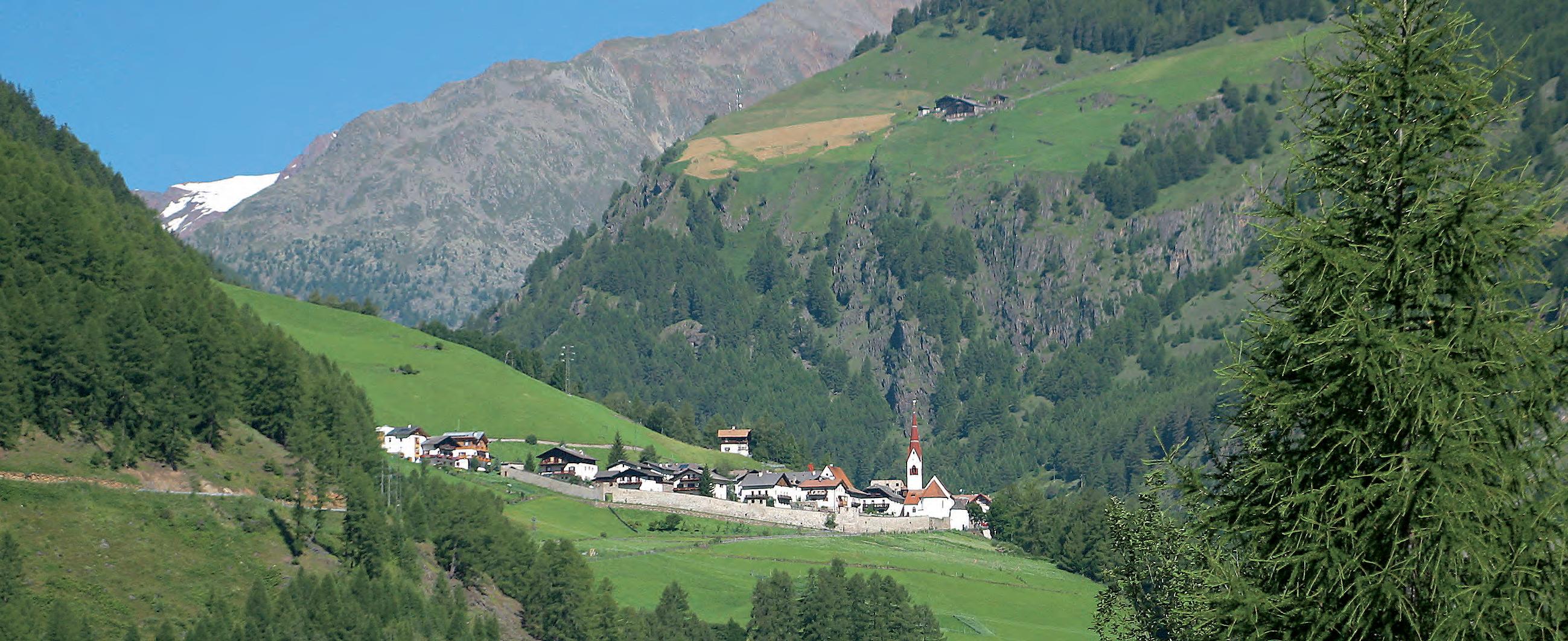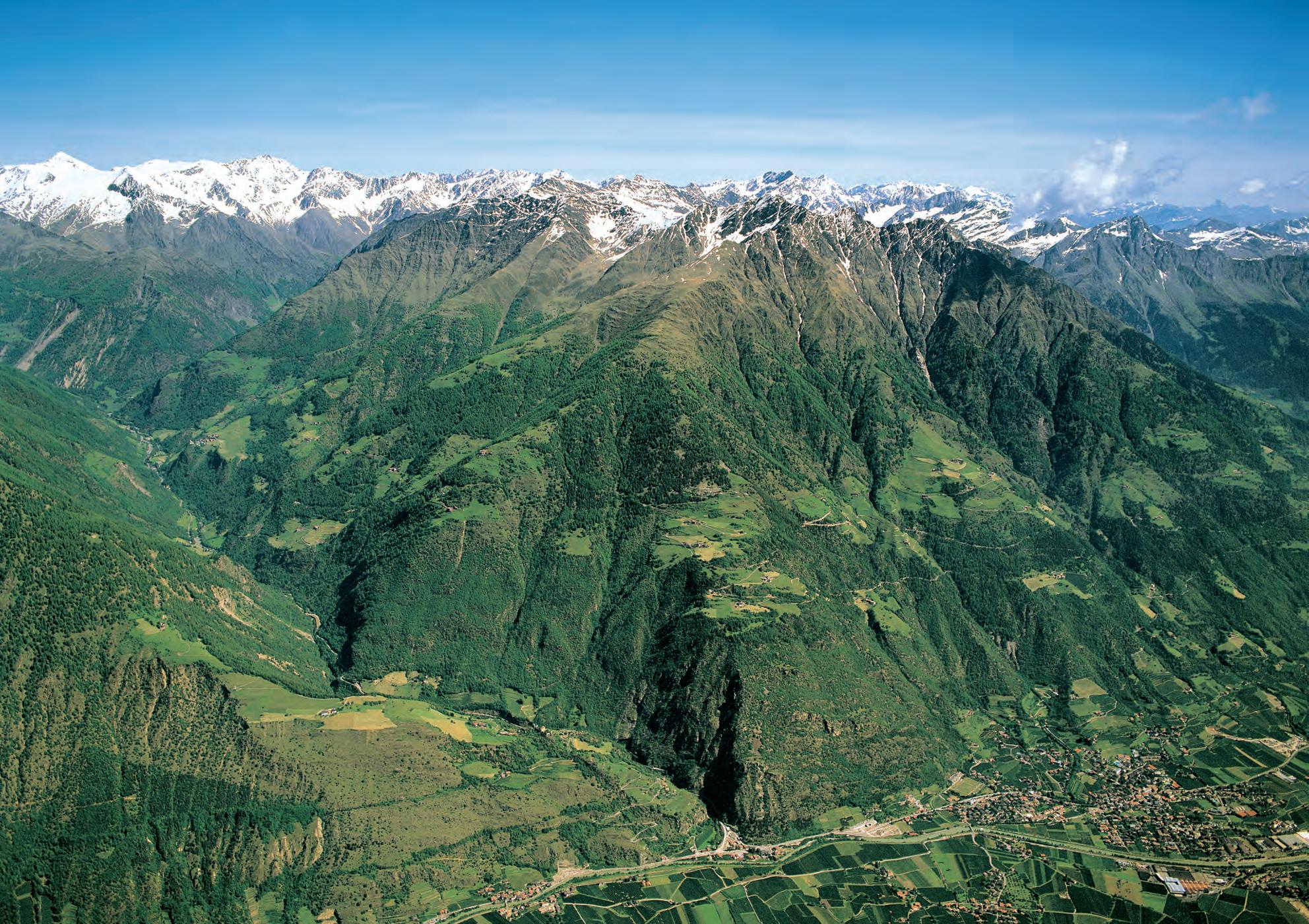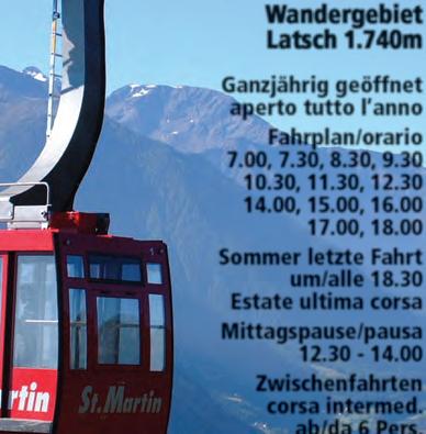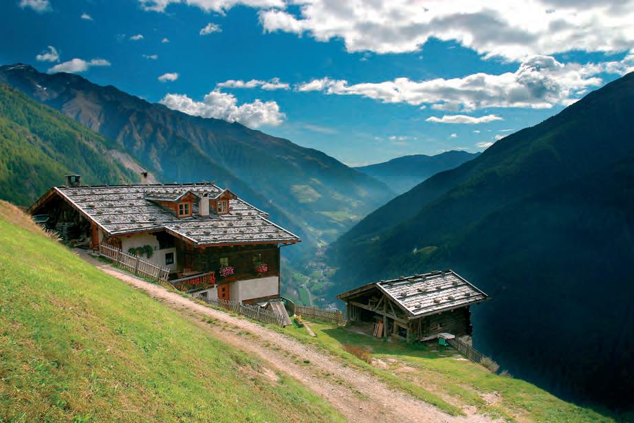 onne satt am Sonnenberg. Und das an 315 Tagen im Jahr. In keinem anderen Ort der Alpen regnet es weniger. Früchte wie Äpfel, Feigen und Trauben reifen an den sonnigen Hängen. Die malerischen Berghöfe mit ihren steilen Wiesen geben einen Einblick in das entbehrungsreiche Leben der Bergbauern. Von dort oben genießt man einen wundervollen Ausblick auf den Vinschgau, das Meraner Becken, das Passeiertal, die Sarntaler-, Stubaier- und Ötztaler Alpen. Bei schönem Wetter sieht man bis in die Dolomiten, die Brenta-Gruppe und das OrtlerMassiv. Am Sonnenberg lassen sich eine Vielzahl von Wanderungen unternehmen. So durchquert der bekannte Meraner Höhenweg den Naturnser Hausberg in seiner vollen Länge. In einer mehrtägigen Tour kann man über diesen Weg die Texelgruppe umrunden. Der Naturpark Texlgruppe ist mit über 30.000 Hektar der größte der sieben Naturparks Südtirols. Felsige Hänge wechseln sich ab mit weiten Lärchenwäldern, blühenden Wiesen, schönen Almen, Flaumeichen, Bergahorn, tosenden Wasserfällen und glasklaren Bächen und Quellen. Wer es gemütlicher mag, kann von Naturns mit der Seilbahn nach Unterstell fahren und von dort den Berg erkunden. Es wird sich ihm eine einzigartige Bergwelt eröffnen, die aufgrund der speziellen klimatischen Bedingungen nirgendwo sonst anzutreffen ist. Einkehren und rasten kann man bei den zahlreichen Gasthöfen, wo man sich mit der guten Südtiroler Küche verwöh-