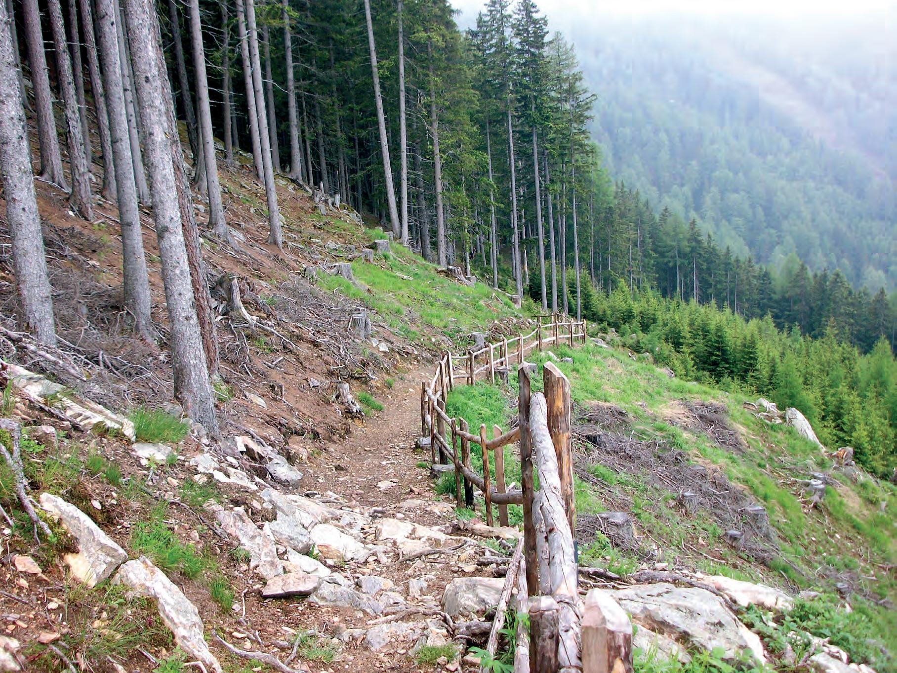 der rechten Seite beginnt der Weg Nr. 7 leicht ansteigend, teils durch steilen Wald und herrliche Wiesen bis zum über 700 Jahre alten Finailhof, dem ehemals höchsten Kornhof Europas auf 1952 m. Hier lädt der urige Balkon zu einer Rast mit unvergleichlichem Blick über den See mit seiner unvergleichlichen Färbung und das ganze Tal ein. Ein Blick in die urige Küche mit seiner rußgeschwärzten Decke und den typischen Köstlichkeiten auf dem Holzherd lohnen! Von hier führt der Panoramaweg weiter an zwei alten Höfen vorbei hinab nach Vernagt.