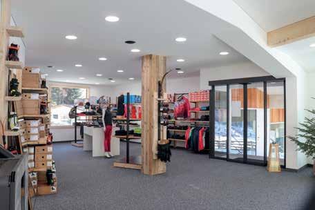 Große, rahmenlose, fixe Fenster fluten nicht nur den Neubau mit Licht, sondern sind auch Schaufenster und geben einen Vorgeschmack und einen Einblick in das Sortiment. Außerdem wird die Aussicht zelebriert und der Blick direkt auf die Natur gelenkt. Den großzügigen Verkaufs- und Skiverleihraum komplettieren ein Schuhraum und ein WC. Im Schuhraum können die Langlaufschuhe getrocknet werden. Die Langlaufskier hingegen werden – auf Wunsch – präpariert und ein Service gemacht.