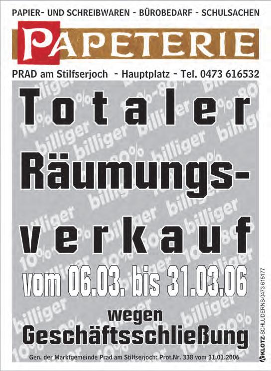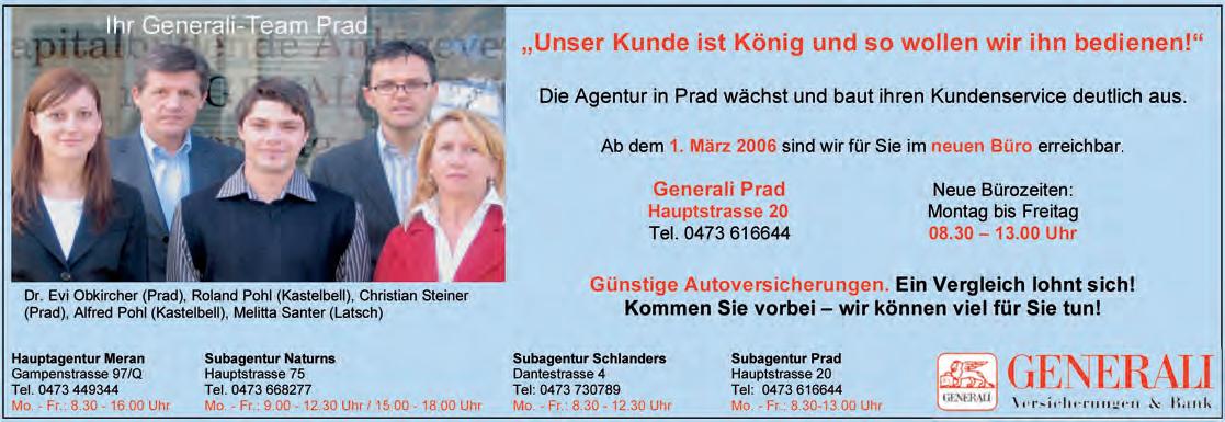Euro: 450 zuzüglich Mehrwertsteuer, Zahlung: 30 Tage nach Rechnungslegung Vormerkungen per Fax (0473-732451) oder direkt im Büro werden ab 6. März vorgenommen. Die Aufträge müssen alle wesentlichen Elemente (inkl. Steuernummer) enthalten und mit leserlicher Unterschrift versehen sein. Des Weiteren gelten die allgemeinen Geschäftsbedingungen, die zu Bürozeiten (8-12 und 14-18 Uhr) in der Dantestr. 4, Schlanders, eingesehen werden können.