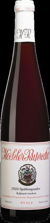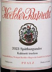 Koehler-Ruprecht Spätburgunder Kabinett Trocken 2023 är gjort på 100 % Pinot Noir från vingårdar runt Kallstadt i Pfalz. I glaset syns en klar, röd färg. Doften bjuder på nyanserade toner av mogna jordgubbar, hallon, skogsbär och en lätt kryddighet, tillsammans med subtila mineraliga undertoner. Smaken är torr med frisk syra, mjuka tanniner och en smakprofil som kombinerar röd frukt med inslag av sandelträ, lingon och en liten hint av pomerans i avslutet.