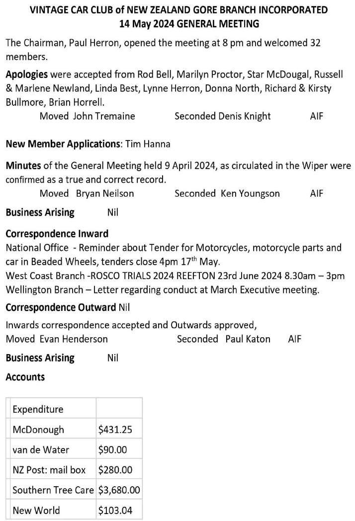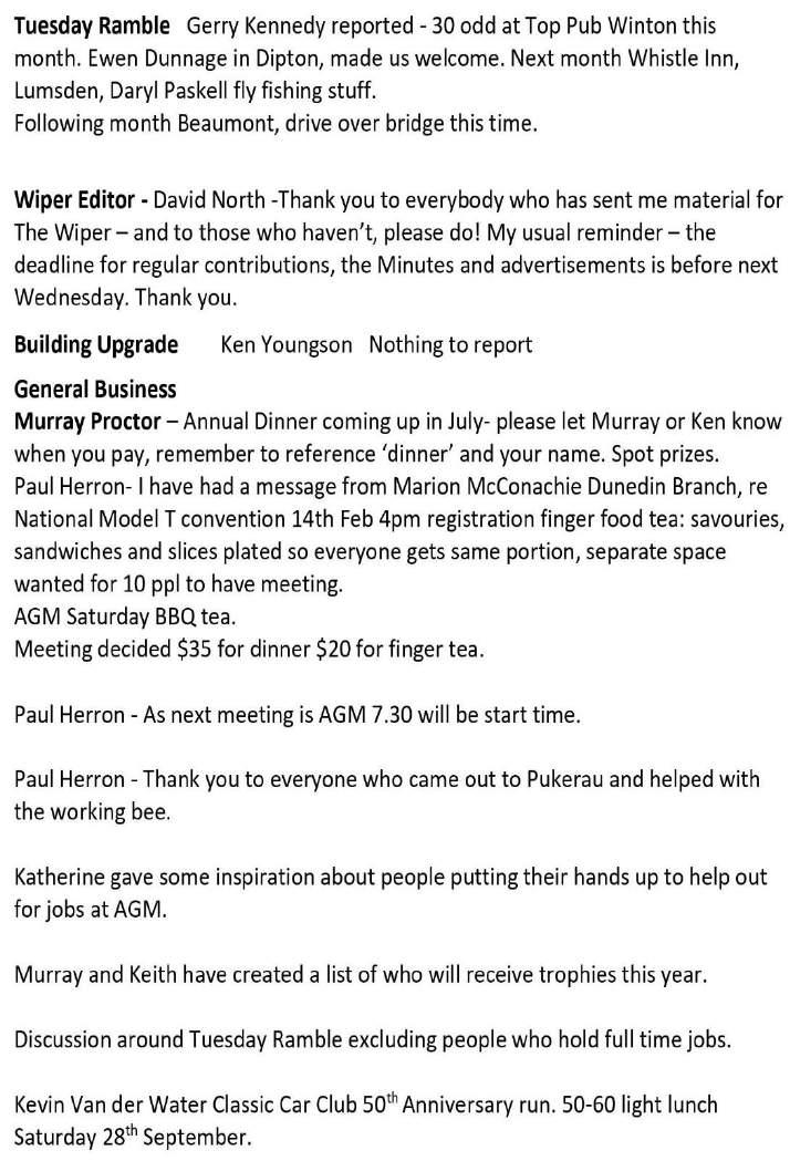 The opinions and statements in The Wiper are those of the authors and do not necessarily reflect the policy or views of the Gore Branch or of the VCC. The Branch accepts no responsibility for the accuracy of any statements. The Wiper is printed by I-Cue 10 Wood Street, Invercargill Telephone (03) 218 3350
