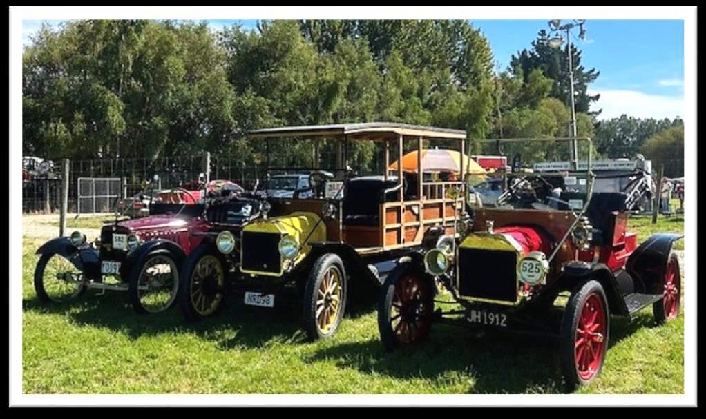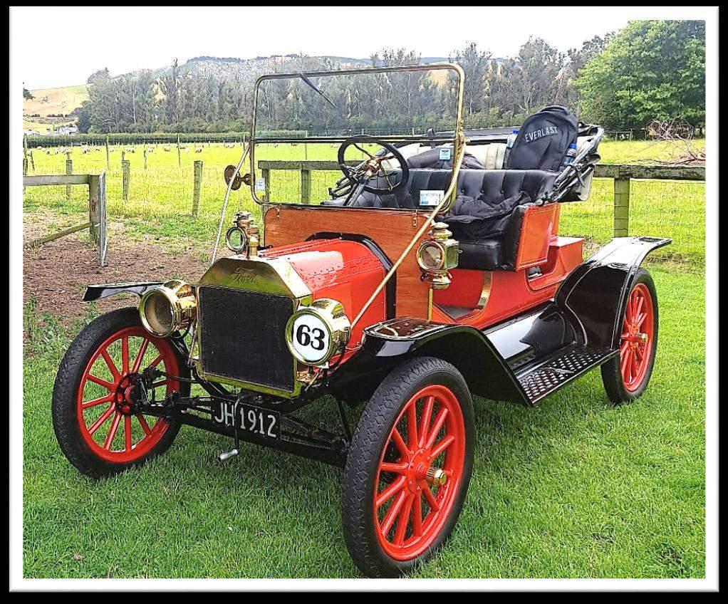 We made it to Paul’s father’s place without incident. With Bob Herron’s ‘15T, Paul’s ‘11 and us in the ‘12 we drove in convoythrough Quarry Road to Sunnyvale Sports Centre to ”Meet & Greet” and receive instructions for the Run. It was a good time to wander around all the cars and bikes and marvel at the mechanical advances that were made in such a short period in time.Ahighlight for me was the Stanley Steamer. I had the exact one as a model when I was a young fella and I remember reading on the box that theywere capableofdoing100mph forwards -and in reverse!! Imentioned this to the owner and he confirmed what I had read but advised against trying it!
