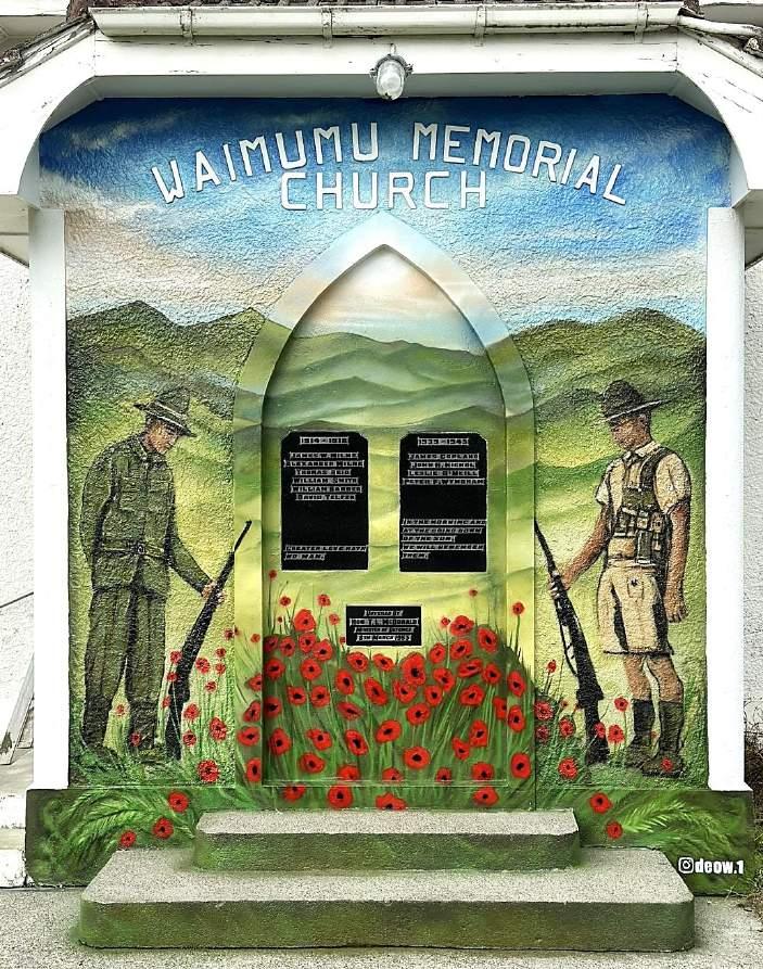 Mural on the old Waimumu Church, painted by DEOW