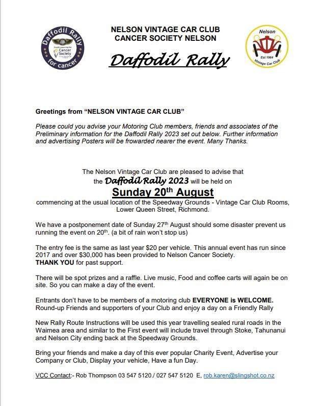 Sunday 20th. Daffodil Rally for Cancer. Club rooms from 11am. Help needed. Rob.