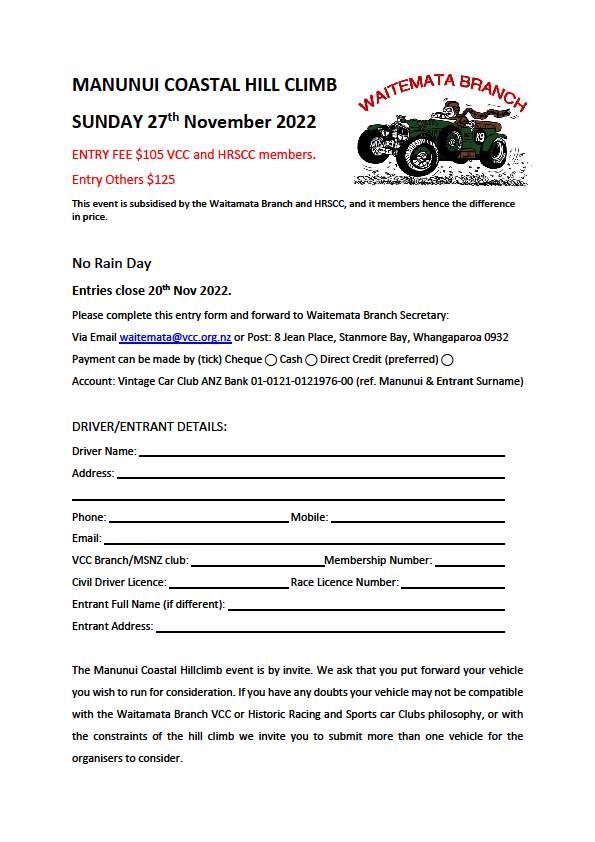 Sun 27 Nov 07:30 Mananui Coastal Hillclimb hosted by Waitemata Branch
