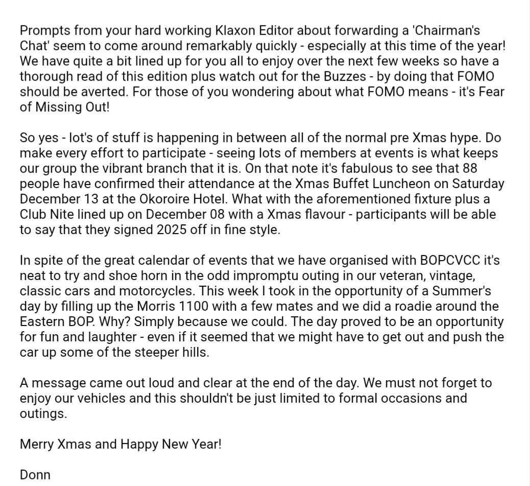 As I write this edition, there is still the Christmas functions and the December events to be held. I look forward to meeting you all there.