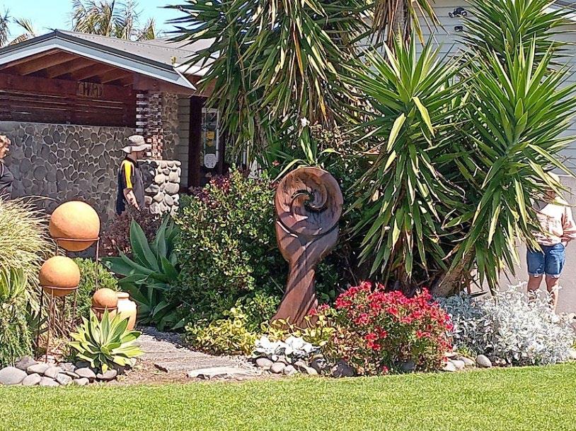 Our next stop was at Lakeside Garden, on Mid Kahui Rd, Rahotu,A large country garden with a lake, mountain views and a coffee house where we were able to enjoy our lunch in lovely surroundings. Following lunch we left for Opunake to visit Winterfell Garden, A lush town garden with lots of surprising plants and artwork for sale. Our last visit in Opunake was to Fabulous Flowers, a lovely town garden, with an interesting selection of plants, pots and mosaic containers and only 100 metres from the beach clifftop.