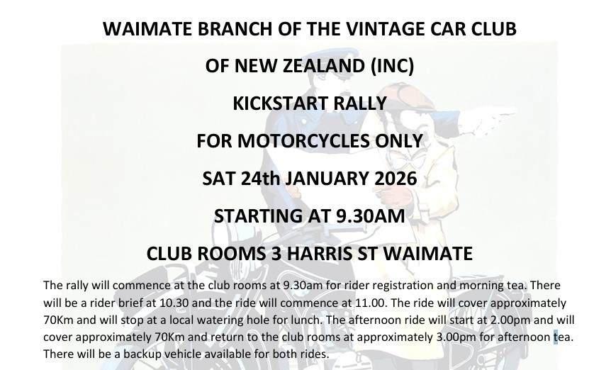 Saturday 14th February 2026 At 10.00am Entries to Wallaby Rally Organiser Waimate VCC 4 Harris Street Waimate 7924