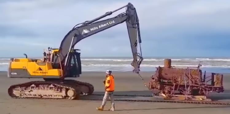 “Skunk” being towed on a sledge from the Whanganui river mouth after being found last year and excavated.