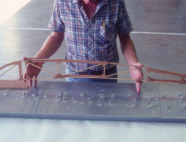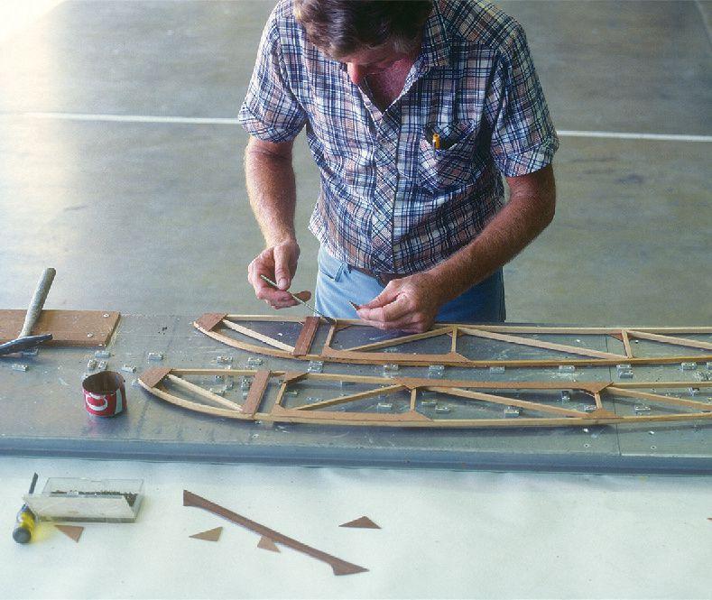 strut. I then mixed resin and added cotton linters to make a thick paste and stuck the fairings to the struts, applying pressure with masking tape until cured. Adding filler material (cotton linters) to epoxy resin makes a good gap-filling adhesive, but it doesn’t sand easily, so wipe off excess resin that squeezes out. I then sanded and wrapped the fairings with pinked-edge surface tape and finished with the Poly-Fiber process. It worked great and is very lightweight.
