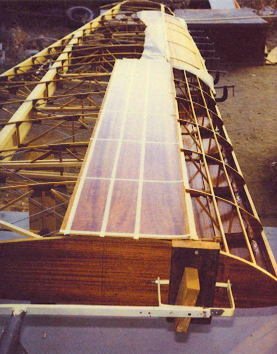 The upper left wing for a New Standard ready for installation of plywood leading edge. The lower skin is bonded in place and varnished well to resist water damage. Outboard skin is bonded in place, and nailing strips can be seen applying pressure to the adhesive joints. Inboard skin has been prepared by applying several coats of varnish. Note the rib, spar, and stringer locations do not have varnish but are the raw wood. A light sanding, just enough to scratch the surface, will improve bonding strength. Adhesive is applied to both surfaces to be bonded, and the skin aligned and tacked in place at the upper corners. Now the nailing strips are put into place to apply pressure to the joint. Waxed paper is placed between nailing strips and skin. I’ll go into more detail as to how to align, mark, and apply skin in a future article.